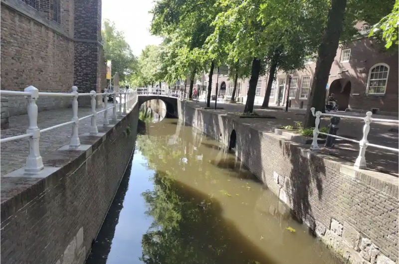 We lopen richting Oude Kerk, maar blijven nog even op de Oude Delft. Het water in de Delftse grachten is gelijk aan het boezempeil in het Rijn-Schiekanaal. Dat kan je goed zien op de peilschaal in de Oude Delft tegenover het Gemeenlandshuis. Dat boezempeil wordt door het Hoogheemraadschap van Delfland op 43 centimeter onder NAP (Normaal Amsterdams Peil) gehouden. NAP is ongeveer gemiddeld zeeniveau bij Scheveningen. Hier is de kademuur erg hoog, dus het maaiveld (de straat) ligt flink boven het boezempeil. Dat is anders elders in de stad, zoals we verderop in de wandeling zien. Daar komt het water bijna tot aan de rand van de kade. Die delen van Delft zijn gebouwd op klei en veen, terwijl de vroegste bebouwing langs de Oude Delft gebeurde op een kreekrug. Een kreekrug is een hooggelegen zandlichaam in de Holocene klei- en veenafzettingen in ons gebied. Meer informatie vind je in “Wat is een kreekrug?“